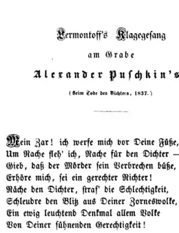 - Selon Lermontov : « j'ai écrit mes vers pour la mort de Pouchkine (Déclaration du cornette du régiment des hussards de la Garde Lermontov) »