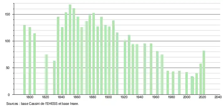 L'évolution du nombre d'habitants est connue à travers les recensements de la population effectués dans la commune depuis 1793. Pour les communes de moins de 10 000 habitants, une enquête de recensement portant sur toute la population est réalisée tous les cinq ans, les populations légales des années intermédiaires étant quant à elles estimées par interpolation ou extrapolation[29]. Pour la commune, le premier recensement exhaustif entrant dans le cadre du nouveau dispositif a été réalisé en 2007[30].