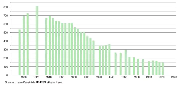 L'évolution du nombre d'habitants est connue à travers les recensements de la population effectués dans la commune depuis 1793. Pour les communes de moins de 10 000 habitants, une enquête de recensement portant sur toute la population est réalisée tous les cinq ans, les populations légales des années intermédiaires étant quant à elles estimées par interpolation ou extrapolation[34]. Pour la commune, le premier recensement exhaustif entrant dans le cadre du nouveau dispositif a été réalisé en 2006[35].