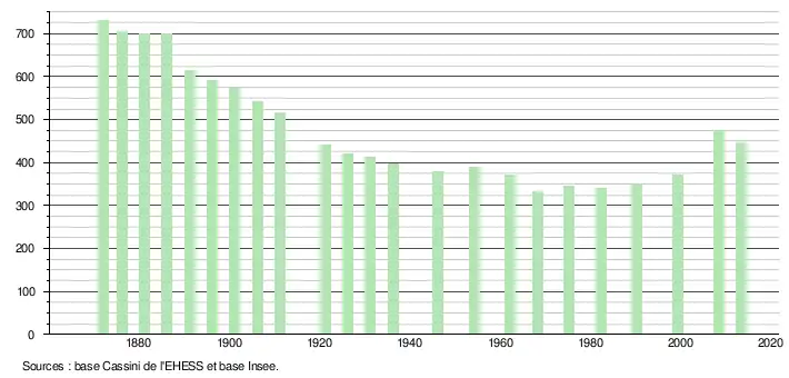 L'évolution du nombre d'habitants est connue à travers les recensements de la population effectués dans la commune depuis 1872. À partir du , les populations légales des communes sont publiées annuellement dans le cadre d'un recensement qui repose désormais sur une collecte d'information annuelle, concernant successivement tous les territoires communaux au cours d'une période de cinq ans. Pour les communes de moins de 10 000 habitants, une enquête de recensement portant sur toute la population est réalisée tous les cinq ans, les populations légales des années intermédiaires étant quant à elles estimées par interpolation ou extrapolation[14]. Pour la commune, le premier recensement exhaustif entrant dans le cadre du nouveau dispositif a été réalisé en 2008[15],[Note 1].