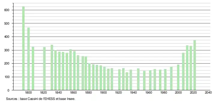 L'évolution du nombre d'habitants est connue à travers les recensements de la population effectués dans la commune depuis 1793. Pour les communes de moins de 10 000 habitants, une enquête de recensement portant sur toute la population est réalisée tous les cinq ans, les populations légales des années intermédiaires étant quant à elles estimées par interpolation ou extrapolation[20]. Pour la commune, le premier recensement exhaustif entrant dans le cadre du nouveau dispositif a été réalisé en 2006[21].
