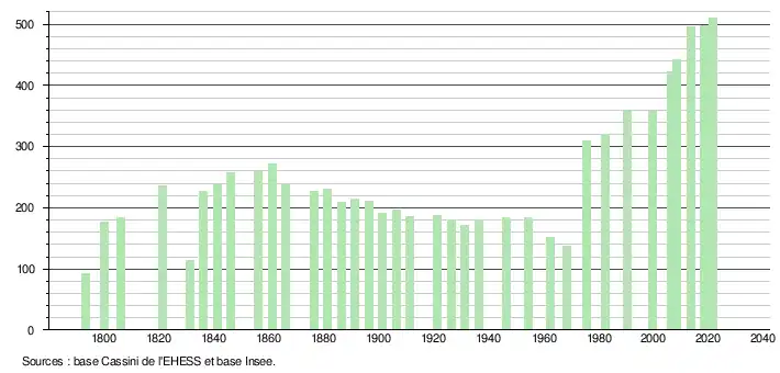 L'évolution du nombre d'habitants est connue à travers les recensements de la population effectués dans la commune depuis 1793. Pour les communes de moins de 10 000 habitants, une enquête de recensement portant sur toute la population est réalisée tous les cinq ans, les populations légales des années intermédiaires étant quant à elles estimées par interpolation ou extrapolation[20]. Pour la commune, le premier recensement exhaustif entrant dans le cadre du nouveau dispositif a été réalisé en 2008[21].