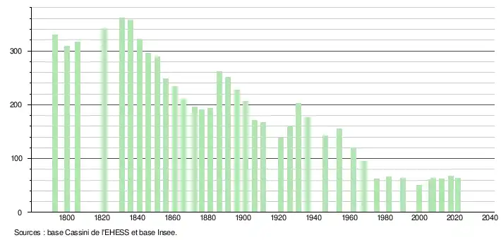 L'évolution du nombre d'habitants est connue à travers les recensements de la population effectués dans la commune depuis 1793. Pour les communes de moins de 10 000 habitants, une enquête de recensement portant sur toute la population est réalisée tous les cinq ans, les populations légales des années intermédiaires étant quant à elles estimées par interpolation ou extrapolation[22]. Pour la commune, le premier recensement exhaustif entrant dans le cadre du nouveau dispositif a été réalisé en 2007[23].