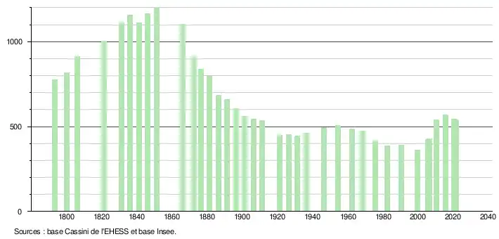 L'évolution du nombre d'habitants est connue à travers les recensements de la population effectués dans la commune depuis 1793. Pour les communes de moins de 10 000 habitants, une enquête de recensement portant sur toute la population est réalisée tous les cinq ans, les populations légales des années intermédiaires étant quant à elles estimées par interpolation ou extrapolation[16]. Pour la commune, le premier recensement exhaustif entrant dans le cadre du nouveau dispositif a été réalisé en 2005[17].