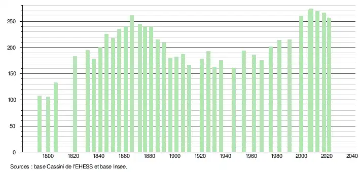 L'évolution du nombre d'habitants est connue à travers les recensements de la population effectués dans la commune depuis 1793. Pour les communes de moins de 10 000 habitants, une enquête de recensement portant sur toute la population est réalisée tous les cinq ans, les populations légales des années intermédiaires étant quant à elles estimées par interpolation ou extrapolation[20]. Pour la commune, le premier recensement exhaustif entrant dans le cadre du nouveau dispositif a été réalisé en 2007[21].