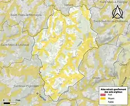 Le retrait-gonflement des sols argileux est susceptible d'engendrer des dommages importants aux bâtiments en cas d’alternance de périodes de sécheresse et de pluie. 41,8 % de la superficie communale est en aléa moyen ou fort (33,6 % au niveau départemental et 48,5 % au niveau national). Sur les 257 bâtiments dénombrés sur la commune en 2019, 70 sont en aléa moyen ou fort, soit 27 %, à comparer aux 25 % au niveau départemental et 54 % au niveau national. Une cartographie de l'exposition du territoire national au retrait gonflement des sols argileux est disponible sur le site du BRGM[16],[Carte 2].