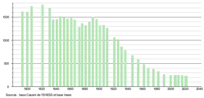 L'évolution du nombre d'habitants est connue à travers les recensements de la population effectués dans la commune depuis 1793. Pour les communes de moins de 10 000 habitants, une enquête de recensement portant sur toute la population est réalisée tous les cinq ans, les populations légales des années intermédiaires étant quant à elles estimées par interpolation ou extrapolation[20]. Pour la commune, le premier recensement exhaustif entrant dans le cadre du nouveau dispositif a été réalisé en 2005[21].