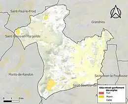 Le retrait-gonflement des sols argileux est susceptible d'engendrer des dommages importants aux bâtiments en cas d’alternance de périodes de sécheresse et de pluie. 2,5 % de la superficie communale est en aléa moyen ou fort (15,8 % au niveau départemental et 48,5 % au niveau national). Sur les 102 bâtiments dénombrés sur la commune en 2019, aucun n'est en aléa moyen ou fort, à comparer aux 14 % au niveau départemental et 54 % au niveau national. Une cartographie de l'exposition du territoire national au retrait gonflement des sols argileux est disponible sur le site du BRGM[18],[Carte 2].