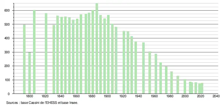 L'évolution du nombre d'habitants est connue à travers les recensements de la population effectués dans la commune depuis 1793. Pour les communes de moins de 10 000 habitants, une enquête de recensement portant sur toute la population est réalisée tous les cinq ans, les populations légales des années intermédiaires étant quant à elles estimées par interpolation ou extrapolation[22]. Pour la commune, le premier recensement exhaustif entrant dans le cadre du nouveau dispositif a été réalisé en 2008[23].