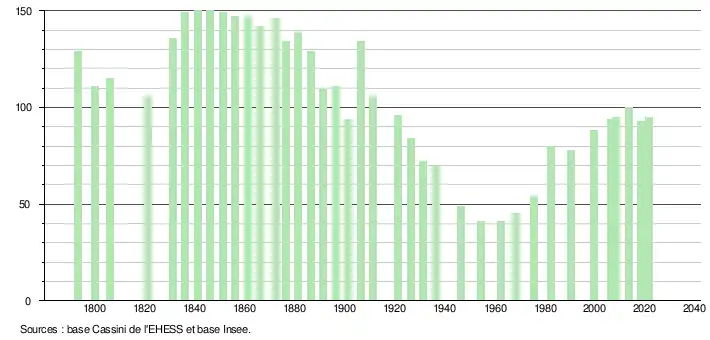 L'évolution du nombre d'habitants est connue à travers les recensements de la population effectués dans la commune depuis 1793. Pour les communes de moins de 10 000 habitants, une enquête de recensement portant sur toute la population est réalisée tous les cinq ans, les populations légales des années intermédiaires étant quant à elles estimées par interpolation ou extrapolation[20]. Pour la commune, le premier recensement exhaustif entrant dans le cadre du nouveau dispositif a été réalisé en 2008[21].