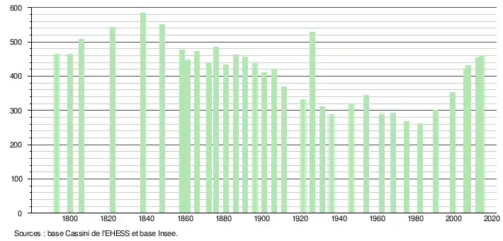 L'évolution du nombre d'habitants est connue à travers les recensements de la population effectués dans la commune depuis 1793. Pour les communes de moins de 10 000 habitants, une enquête de recensement portant sur toute la population est réalisée tous les cinq ans, les populations légales des années intermédiaires étant quant à elles estimées par interpolation ou extrapolation[8]. Pour la commune, le premier recensement exhaustif entrant dans le cadre du nouveau dispositif a été réalisé en 2007[9].