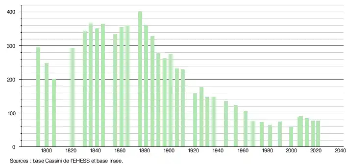 L'évolution du nombre d'habitants est connue à travers les recensements de la population effectués dans la commune depuis 1793. Pour les communes de moins de 10 000 habitants, une enquête de recensement portant sur toute la population est réalisée tous les cinq ans, les populations légales des années intermédiaires étant quant à elles estimées par interpolation ou extrapolation[26]. Pour la commune, le premier recensement exhaustif entrant dans le cadre du nouveau dispositif a été réalisé en 2007[27].