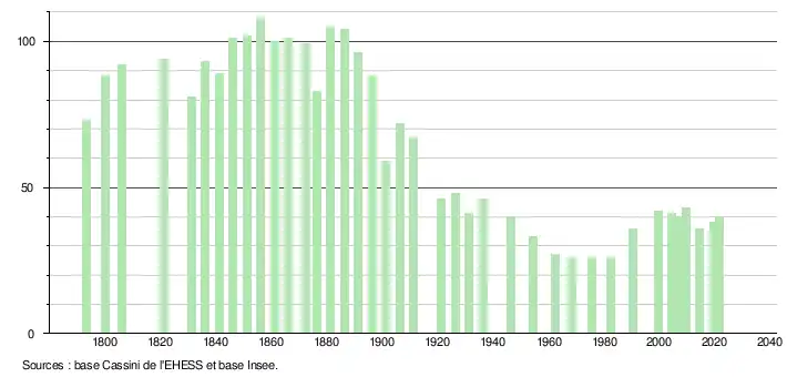 L'évolution du nombre d'habitants est connue à travers les recensements de la population effectués dans la commune depuis 1793. Pour les communes de moins de 10 000 habitants, une enquête de recensement portant sur toute la population est réalisée tous les cinq ans, les populations légales des années intermédiaires étant quant à elles estimées par interpolation ou extrapolation[17]. Pour la commune, le premier recensement exhaustif entrant dans le cadre du nouveau dispositif a été réalisé en 2004[18].