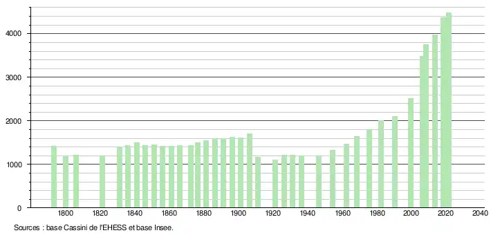 L'évolution du nombre d'habitants est connue à travers les recensements de la population effectués dans la commune depuis 1793. Pour les communes de moins de 10 000 habitants, une enquête de recensement portant sur toute la population est réalisée tous les cinq ans, les populations légales des années intermédiaires étant quant à elles estimées par interpolation ou extrapolation[26]. Pour la commune, le premier recensement exhaustif entrant dans le cadre du nouveau dispositif a été réalisé en 2008[27].