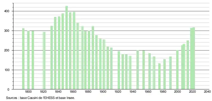 L'évolution du nombre d'habitants est connue à travers les recensements de la population effectués dans la commune depuis 1793. Pour les communes de moins de 10 000 habitants, une enquête de recensement portant sur toute la population est réalisée tous les cinq ans, les populations légales des années intermédiaires étant quant à elles estimées par interpolation ou extrapolation[20]. Pour la commune, le premier recensement exhaustif entrant dans le cadre du nouveau dispositif a été réalisé en 2008[21].