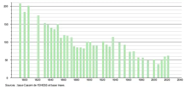 L'évolution du nombre d'habitants est connue à travers les recensements de la population effectués dans la commune depuis 1793. Pour les communes de moins de 10 000 habitants, une enquête de recensement portant sur toute la population est réalisée tous les cinq ans, les populations légales des années intermédiaires étant quant à elles estimées par interpolation ou extrapolation[17]. Pour la commune, le premier recensement exhaustif entrant dans le cadre du nouveau dispositif a été réalisé en 2006[18].