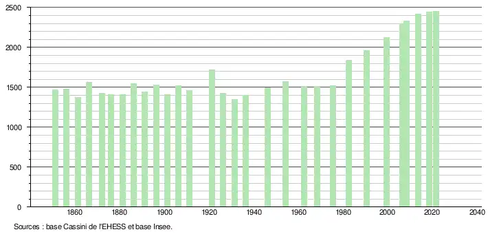 L'évolution du nombre d'habitants est connue à travers les recensements de la population effectués dans la commune depuis 1851. Pour les communes de moins de 10 000 habitants, une enquête de recensement portant sur toute la population est réalisée tous les cinq ans, les populations légales des années intermédiaires étant quant à elles estimées par interpolation ou extrapolation[19]. Pour la commune, le premier recensement exhaustif entrant dans le cadre du nouveau dispositif a été réalisé en 2008[20].
