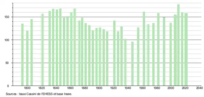 L'évolution du nombre d'habitants est connue à travers les recensements de la population effectués dans la commune depuis 1793. Pour les communes de moins de 10 000 habitants, une enquête de recensement portant sur toute la population est réalisée tous les cinq ans, les populations légales des années intermédiaires étant quant à elles estimées par interpolation ou extrapolation[17]. Pour la commune, le premier recensement exhaustif entrant dans le cadre du nouveau dispositif a été réalisé en 2005[18].