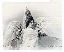 La première de l'opéra qui inspira Vroubel, eut lieu à l'opéra privé de Savva Mamontov, le . Vroubel créa les esquisses des décors et des costumes, et c'est son épouse Nadejda Zabela-Vroubel qui chanta la partition de la princesse cygne. Selon ses contemporains :