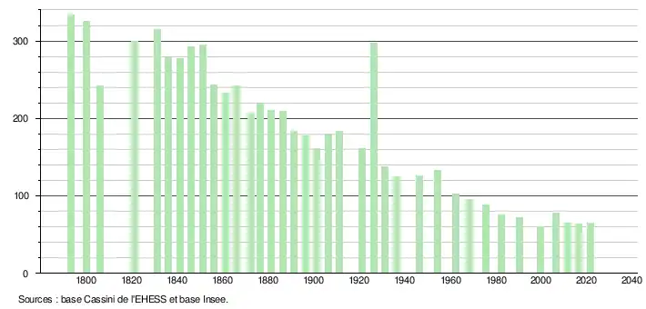 L'évolution du nombre d'habitants est connue à travers les recensements de la population effectués dans la commune depuis 1793. Pour les communes de moins de 10 000 habitants, une enquête de recensement portant sur toute la population est réalisée tous les cinq ans, les populations légales des années intermédiaires étant quant à elles estimées par interpolation ou extrapolation[17]. Pour la commune, le premier recensement exhaustif entrant dans le cadre du nouveau dispositif a été réalisé en 2006[18].