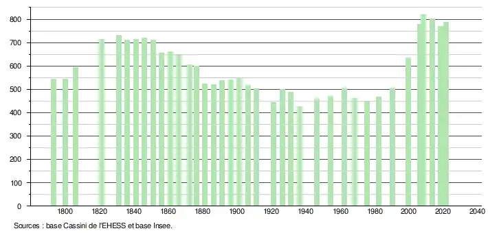 L'évolution du nombre d'habitants est connue à travers les recensements de la population effectués dans la commune depuis 1793. Pour les communes de moins de 10 000 habitants, une enquête de recensement portant sur toute la population est réalisée tous les cinq ans, les populations légales des années intermédiaires étant quant à elles estimées par interpolation ou extrapolation[21]. Pour la commune, le premier recensement exhaustif entrant dans le cadre du nouveau dispositif a été réalisé en 2008[22].