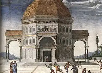 La scène principale est encadrée par les lignes en perspective d'un pavement à grosses dalles carrées en marbre d'une place décorée d'édifices monumentaux. Au centre selon les règles de la symétrie, une rangée centrale de dalles conduit à l'entrée d'un édifice remarquable à plan central avec coupole, symbole de l'universalité du pouvoir papal et transposition idéale du Temple de Jérusalem : Ce motif a été réutilisé dans Le Mariage de la Vierge (musée des beaux-arts de Caen) avec la variante de la porte centrale qui laisse voir le paysage comme infini dans le point de fuite central. Cette vision architecturale, expression des idéaux de perfection classique de la Renaissance a été reprise par les élèves du Pérugin, comme Pinturicchio dans la chapelle Bufalini et surtout Raphaël dans Le Mariage de la Vierge (Pinacothèque de Brera). Elle influença aussi Bramante qui la reproduisit dans le Tempietto.