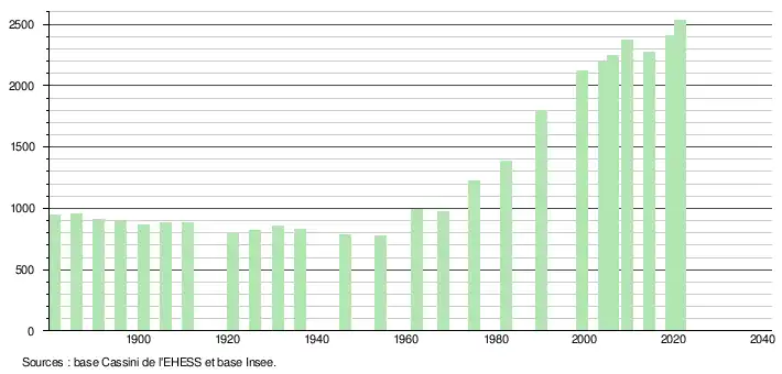 L'évolution du nombre d'habitants est connue à travers les recensements de la population effectués dans la commune depuis 1881. Pour les communes de moins de 10 000 habitants, une enquête de recensement portant sur toute la population est réalisée tous les cinq ans, les populations légales des années intermédiaires étant quant à elles estimées par interpolation ou extrapolation[42]. Pour la commune, le premier recensement exhaustif entrant dans le cadre du nouveau dispositif a été réalisé en 2004[43].