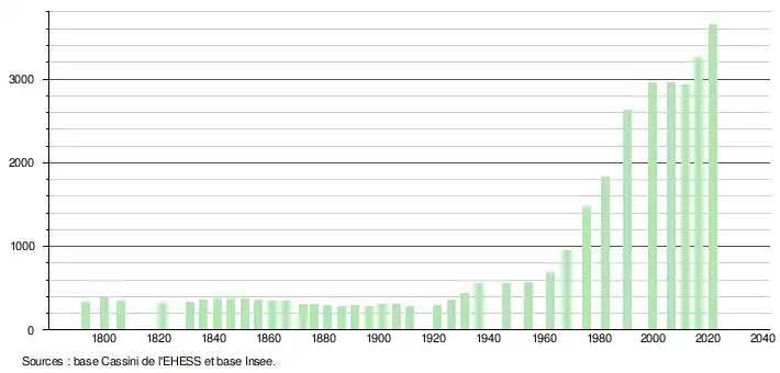 L'évolution du nombre d'habitants est connue à travers les recensements de la population effectués dans la commune depuis 1793. Pour les communes de moins de 10 000 habitants, une enquête de recensement portant sur toute la population est réalisée tous les cinq ans, les populations légales des années intermédiaires étant quant à elles estimées par interpolation ou extrapolation[24]. Pour la commune, le premier recensement exhaustif entrant dans le cadre du nouveau dispositif a été réalisé en 2006[25].