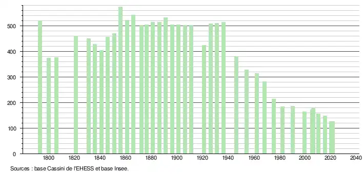 | L'évolution du nombre d'habitants est connue à travers les recensements de la population effectués dans la commune depuis 1793. Pour les communes de moins de 10 000 habitants, une enquête de recensement portant sur toute la population est réalisée tous les cinq ans, les populations légales des années intermédiaires étant quant à elles estimées par interpolation ou extrapolation[23]. Pour la commune, le premier recensement exhaustif entrant dans le cadre du nouveau dispositif a été réalisé en 2005[24]. En 2021, la commune comptait 126 habitants[Note 3], en diminution de 16 % par rapport à 2015 (Corrèze : −0,86 %, France hors Mayotte : +1,84 %). |
