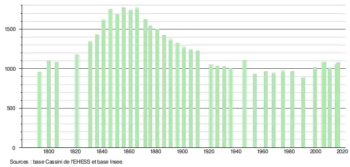 L'évolution du nombre d'habitants est connue à travers les recensements de la population effectués dans la commune depuis 1793. Pour les communes de moins de 10 000 habitants, une enquête de recensement portant sur toute la population est réalisée tous les cinq ans, les populations légales des années intermédiaires étant quant à elles estimées par interpolation ou extrapolation[11]. Pour la commune, le premier recensement exhaustif entrant dans le cadre du nouveau dispositif a été réalisé en 2005[12].