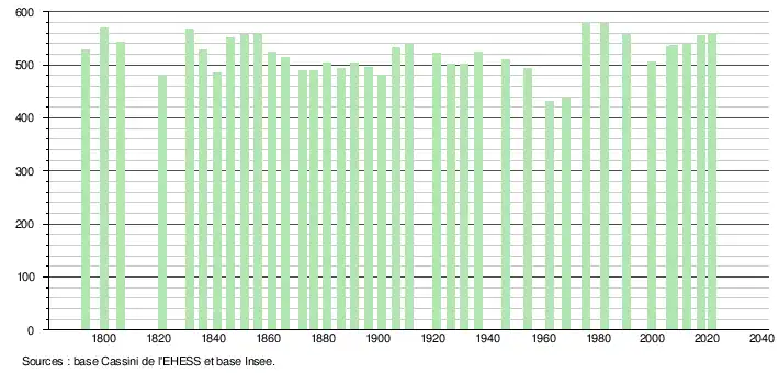 L'évolution du nombre d'habitants est connue à travers les recensements de la population effectués dans la commune depuis 1793. Pour les communes de moins de 10 000 habitants, une enquête de recensement portant sur toute la population est réalisée tous les cinq ans, les populations légales des années intermédiaires étant quant à elles estimées par interpolation ou extrapolation[23]. Pour la commune, le premier recensement exhaustif entrant dans le cadre du nouveau dispositif a été réalisé en 2007[24].