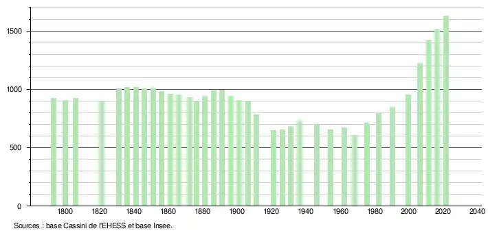 L'évolution du nombre d'habitants est connue à travers les recensements de la population effectués dans la commune depuis 1793. Pour les communes de moins de 10 000 habitants, une enquête de recensement portant sur toute la population est réalisée tous les cinq ans, les populations légales des années intermédiaires étant quant à elles estimées par interpolation ou extrapolation[18]. Pour la commune, le premier recensement exhaustif entrant dans le cadre du nouveau dispositif a été réalisé en 2006[19].