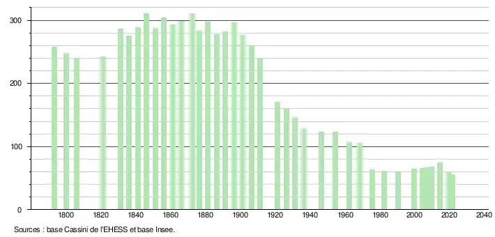 L'évolution du nombre d'habitants est connue à travers les recensements de la population effectués dans la commune depuis 1793. Pour les communes de moins de 10 000 habitants, une enquête de recensement portant sur toute la population est réalisée tous les cinq ans, les populations légales des années intermédiaires étant quant à elles estimées par interpolation ou extrapolation[21]. Pour la commune, le premier recensement exhaustif entrant dans le cadre du nouveau dispositif a été réalisé en 2004[22].