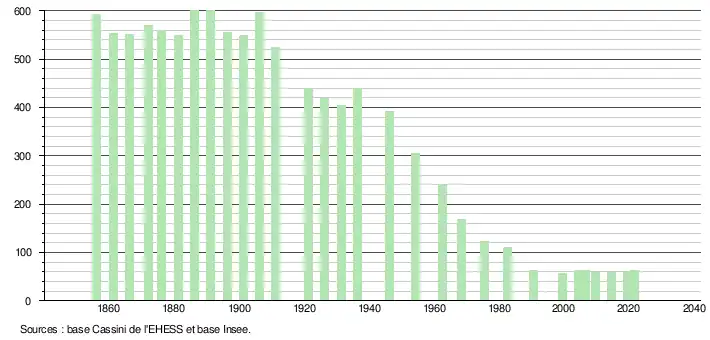L'évolution du nombre d'habitants est connue à travers les recensements de la population effectués dans la commune depuis 1856. Pour les communes de moins de 10 000 habitants, une enquête de recensement portant sur toute la population est réalisée tous les cinq ans, les populations légales des années intermédiaires étant quant à elles estimées par interpolation ou extrapolation[19]. Pour la commune, le premier recensement exhaustif entrant dans le cadre du nouveau dispositif a été réalisé en 2004[20].