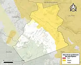 Le retrait-gonflement des sols argileux est susceptible d'engendrer des dommages importants aux bâtiments en cas d’alternance de périodes de sécheresse et de pluie. 42,9 % de la superficie communale est en aléa moyen ou fort (67,4 % au niveau départemental et 48,5 % au niveau national). Sur les 276 bâtiments dénombrés sur la commune en 2019, 174 sont en aléa moyen ou fort, soit 63 %, à comparer aux 81 % au niveau départemental et 54 % au niveau national. Une cartographie de l'exposition du territoire national au retrait gonflement des sols argileux est disponible sur le site du BRGM[26],[Carte 3].
