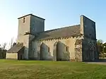 L'église paroissiale Saint-Sébastien est romane. Construite en 1180, elle a remplacé un premier édifice charpenté du XIe siècle. Son architecture est simple : nef unique, faux carré du transept et abside semi-circulaire. Sa façade comporte un portail central à trois voussures nues et deux arcades latérales abritant chacune un petit tympan sculpté[49]. Le toit, récemment restauré, est couvert de lauzes, dallettes calcaires caractéristiques des environs. Elle est classée monument historique depuis 1932[50].