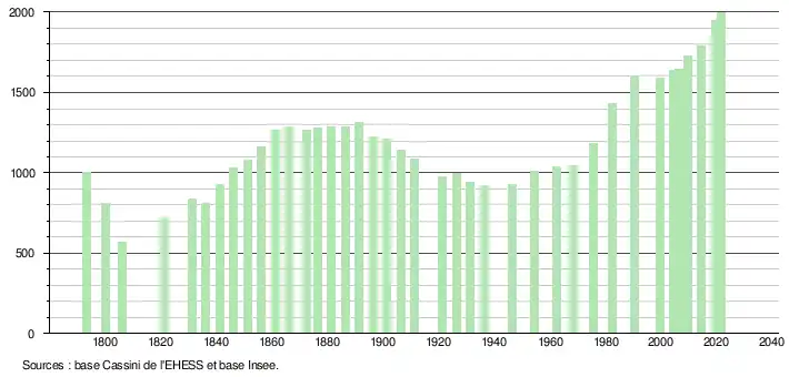 L'évolution du nombre d'habitants est connue à travers les recensements de la population effectués dans la commune depuis 1793. Pour les communes de moins de 10 000 habitants, une enquête de recensement portant sur toute la population est réalisée tous les cinq ans, les populations légales des années intermédiaires étant quant à elles estimées par interpolation ou extrapolation[31]. Pour la commune, le premier recensement exhaustif entrant dans le cadre du nouveau dispositif a été réalisé en 2004[32].