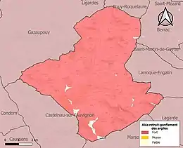 Le retrait-gonflement des sols argileux est susceptible d'engendrer des dommages importants aux bâtiments en cas d’alternance de périodes de sécheresse et de pluie. 98,7 % de la superficie communale est en aléa moyen ou fort (94,5 % au niveau départemental et 48,5 % au niveau national). Sur les 342 bâtiments dénombrés sur la commune en 2019, 339 sont en aléa moyen ou fort, soit 99 %, à comparer aux 93 % au niveau départemental et 54 % au niveau national. Une cartographie de l'exposition du territoire national au retrait gonflement des sols argileux est disponible sur le site du BRGM[21],[Carte 3].