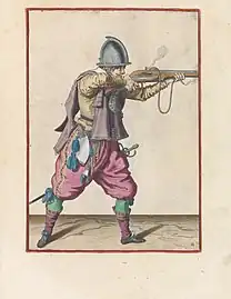 - à droite, enfin, un vieux milicien souffle soit sur le couvre-bassinet pour faire tomber l'excédent de la poudre d'amorçage, soit pour ranimer le feu d'une des extrémités incandescentes de la mèche. On tire en faisant descendre une mèche allumée, bien visible sur ce personnage, jusqu'au bassinet amorcé de poudre fine. Au fond du bassinet, un petit trou — dit lumière — permet de communiquer la flamme à la charge principale au fond du canon. Le détail de ces manœuvres peut être observé dans les maniements d'armes décrits par Jacob De Gheyn l'Ancien ou Colbert de Lostelneau.