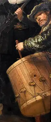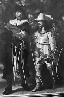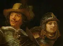 ![]() | Rombout Kemp, sergent avec un chapeau noir à large bord, bras droit tendu et hallebarde sur l’épaule gauche | ![]() | Paulus Harmensz Schoonhoven, mousquetaire avec casque et foulard rouge, en rouge, souffle la poudre brûlée de son mousquet |