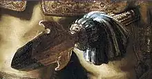 - juste derrière la tête de van Ruytenburch, un milicien ou peut-être un enfant, coiffé d'un casque orné de feuilles de chêne, tire un coup de feu qu'on devine surtout au geste de l'homme au second plan entre les deux officiers ;