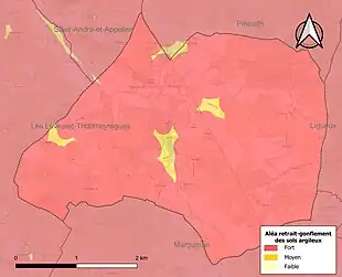 Le retrait-gonflement des sols argileux est susceptible d'engendrer des dommages importants aux bâtiments en cas d’alternance de périodes de sécheresse et de pluie. La totalité de la commune est en aléa moyen ou fort (67,4 % au niveau départemental et 48,5 % au niveau national). Sur les 168 bâtiments dénombrés sur la commune en 2019, 168 sont en aléa moyen ou fort, soit 100 %, à comparer aux 84 % au niveau départemental et 54 % au niveau national. Une cartographie de l'exposition du territoire national au retrait gonflement des sols argileux est disponible sur le site du BRGM[17],[Carte 2].