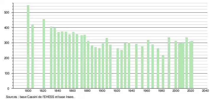 L'évolution du nombre d'habitants est connue à travers les recensements de la population effectués dans la commune depuis 1800. Pour les communes de moins de 10 000 habitants, une enquête de recensement portant sur toute la population est réalisée tous les cinq ans, les populations légales des années intermédiaires étant quant à elles estimées par interpolation ou extrapolation[19]. Pour la commune, le premier recensement exhaustif entrant dans le cadre du nouveau dispositif a été réalisé en 2004[20].