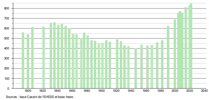 L'évolution du nombre d'habitants est connue à travers les recensements de la population effectués dans la commune depuis 1793. Pour les communes de moins de 10 000 habitants, une enquête de recensement portant sur toute la population est réalisée tous les cinq ans, les populations légales des années intermédiaires étant quant à elles estimées par interpolation ou extrapolation[40]. Pour la commune, le premier recensement exhaustif entrant dans le cadre du nouveau dispositif a été réalisé en 2004[41].