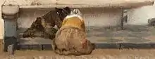 Des quatre personnages attachés à la maison de droite, aucun ne révèle son visage. La strie blanche dans la partie inférieure des bâtisses, qui figure la chaux à laquelle on passait alors les façades, attire le regard du spectateur sur eux[13].