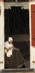 Juste derrière la porte d'entrée, et se détachant de l'obscurité de la pièce dans un effet de cadre dans le cadre, une femme est assise, tournée vers la droite. Elle coud, comme en témoigne la large pièce de tissu blanc qu'elle a posée sur un coussin, sur ses genoux, et sur laquelle elle est penchée. Elle porte un capuchon et un fichu autour du cou, blancs. On distingue en outre sa manche droite, jaune à l'extrémité rouge. Elle a une ample robe bouffante dont la couleur brun sombre se confond presque avec l'ombre derrière elle.