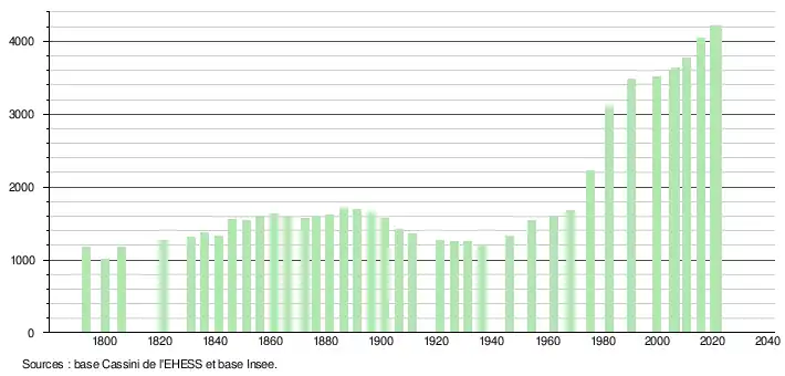 L'évolution du nombre d'habitants est connue à travers les recensements de la population effectués dans la commune depuis 1793. Pour les communes de moins de 10 000 habitants, une enquête de recensement portant sur toute la population est réalisée tous les cinq ans, les populations légales des années intermédiaires étant quant à elles estimées par interpolation ou extrapolation[32]. Pour la commune, le premier recensement exhaustif entrant dans le cadre du nouveau dispositif a été réalisé en 2005[33].