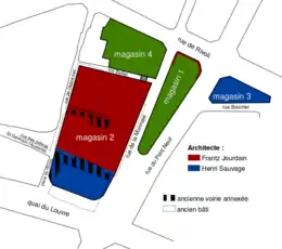 Sous la direction de l'architecte Frantz Jourdain commence en 1905 une phase, qui s’achèvera en 1910, de réaménagement complet et de reconstruction du magasin 2, entre la rue de la Monnaie, la rue Baillet, la rue de l'Arbre-Sec et la rue des Prêtres-Saint-Germain-l'Auxerrois[46] : l'impasse des provençaux est annexée[47], un passage sous la rue de la Monnaie est créé pour faire communiquer les sous-sol des magasins 1 et 2[48], les immeubles sont reconstruits en adoptant une architecture de métal et de verre[49], de nouvelles façades style Art nouveau sont réalisées, des rotondes surmontées de coupoles polychromes[50] sont construites aux deux angles du magasin 2 rue des Prêtres-Saint-Germain-l'Auxerrois[note 3], les parties métalliques sont peintes en « bleu canard »[49] et les façades sont recouvertes de laves émaillées jaunes aux décors floraux[51].