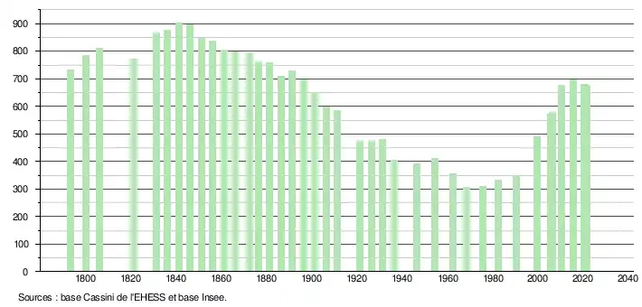 L'évolution du nombre d'habitants est connue à travers les recensements de la population effectués dans la commune depuis 1793. Pour les communes de moins de 10 000 habitants, une enquête de recensement portant sur toute la population est réalisée tous les cinq ans, les populations légales des années intermédiaires étant quant à elles estimées par interpolation ou extrapolation[25]. Pour la commune, le premier recensement exhaustif entrant dans le cadre du nouveau dispositif a été réalisé en 2005[26].