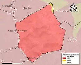 Le retrait-gonflement des sols argileux est susceptible d'engendrer des dommages importants aux bâtiments en cas d’alternance de périodes de sécheresse et de pluie. La totalité de la commune est en aléa moyen ou fort (75,2 % au niveau départemental et 48,5 % au niveau national). Sur les 67 bâtiments dénombrés sur la commune en 2019, 67 sont en aléa moyen ou fort, soit 100 %, à comparer aux 94 % au niveau départemental et 54 % au niveau national. Une cartographie de l'exposition du territoire national au retrait gonflement des sols argileux est disponible sur le site du BRGM[19],[Carte 3].